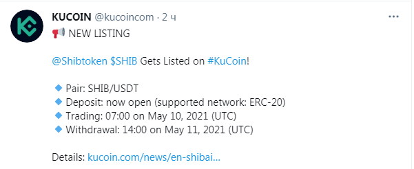 Сразу несколько криптовалютных бирж заявили о листинге нового токена SHIB, который принадлежит децентрализованной бирже ShibaSwap. Одними из первых о листинге новой монеты заявили в Huobi Global. Здесь торги монетой начались еще 8 мая. Позже информация о листинге SHIB появилась и в официальном твитере KuCoin.