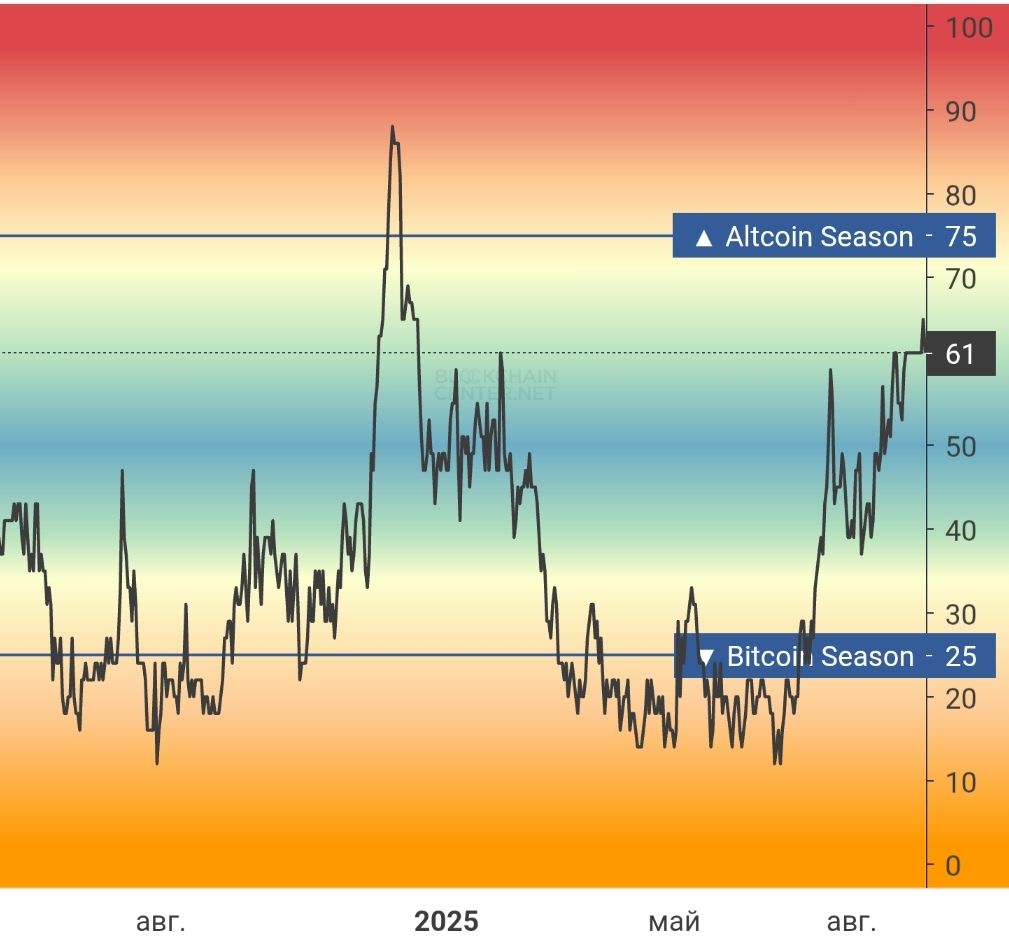 На момент написания обзора, индекс альтсезона blockchaincenter затормозил на отметке 61. Для подтверждения альтсезона нужен прорыв уровня 75.