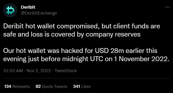 Горячий кошелек криптовалютной биржи Deribit подвергся взлому со стороны неизвестных злоумышленников. Об этом представители торговой площадки сообщили у себя на странице в твиттере.
