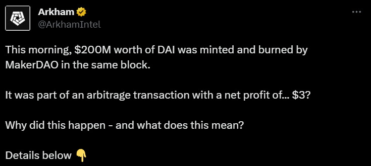 Арбитражный криптобот слил флэш-кредит от MakerDAO на $200 млн ради прибыли в размере $3,24. Об этом у себя на странице в «Твиттере» сообщила исследовательская блокчейн-фирма Arkham.