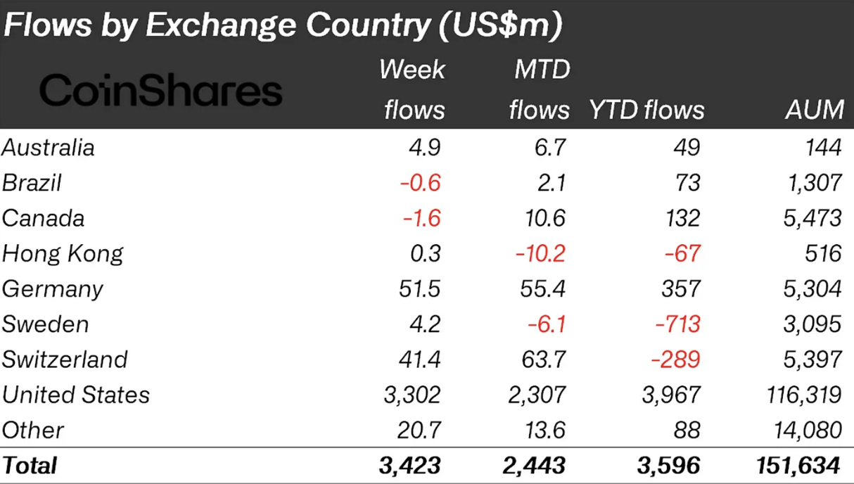 Большая часть притока (93%) пришлась на американских участников рынка, которые вложили $3,3 млрд. Позитивные настроения наблюдались и в других странах. В особенности это было заметно в Германии и Швейцарии. Инвесторы из этих стран инвестировали в криптофонды $51,5 млн и $41,4 млн.