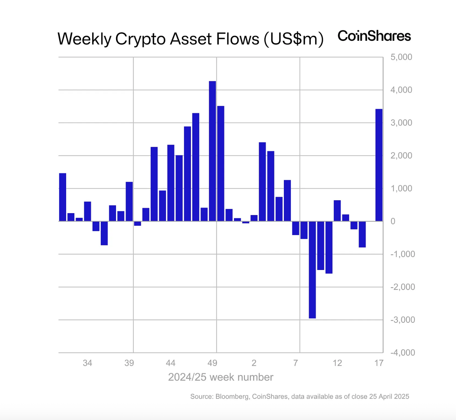 На прошлой неделе — с 21 по 25 апреля — в инвестиционные продукты на базе криптовалют поступило $3,4 млрд