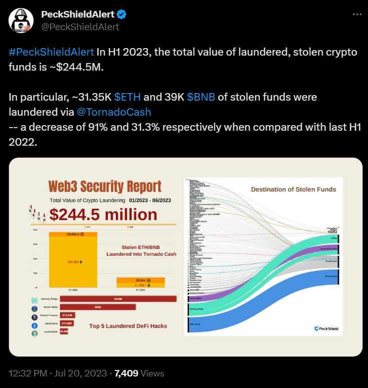 Хакеры смогли успешно отмыть за первое полугодие 2023 года около $244,5 млн в криптовалюте. Подсчет хакерской деятельности аналитики PeckShield опубликовали у себя на твиттер-странице. Согласно данным, больше всего хакеры смогли отмыть в рамках взлома кросс-чейн моста Harmony Bridge (~$100 млн).