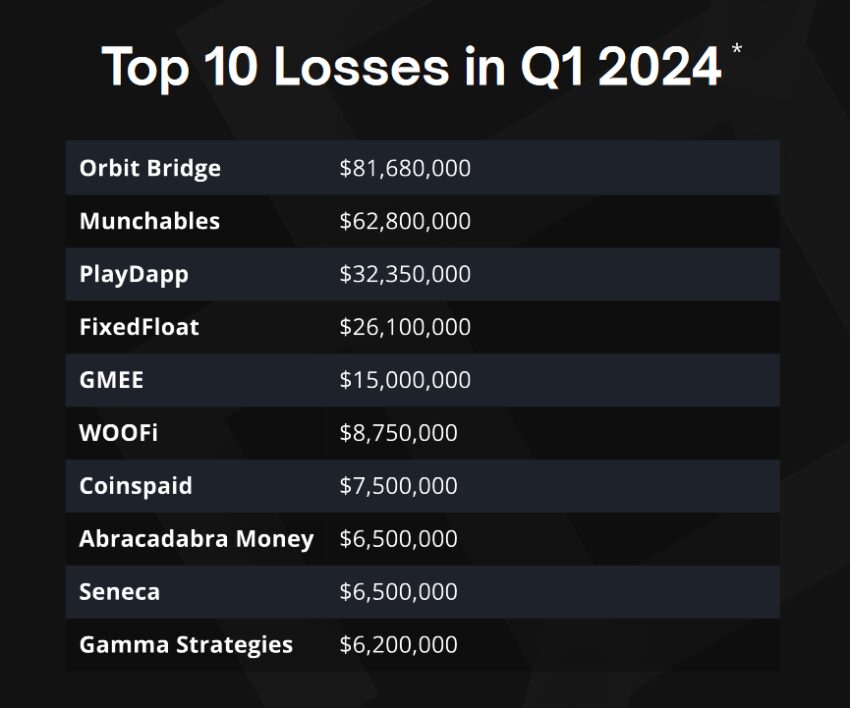 Самыми масштабными взломами стали атаки на мост Orbit и игровую Web3-платформу Munchables. Из первого проекта злоумышленники вытащили более $81 млн, а из второго — почти $63 млн. Вслед за ними идут PlayDapp и FixedFloat, которые потеряли $32 млн и $26 млн соответственно.