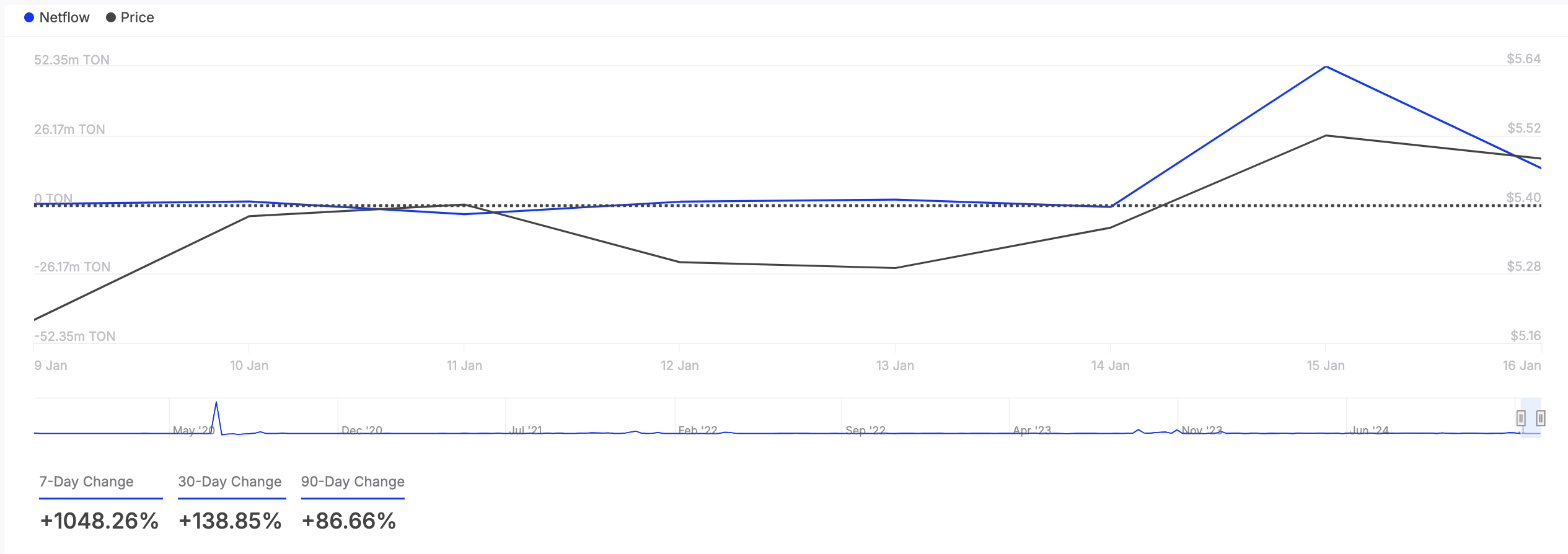 Согласно данным IntoTheBlock, чистый приток крупных держателей Toncoin (TON) увеличился на 1048% за последние семь дней.