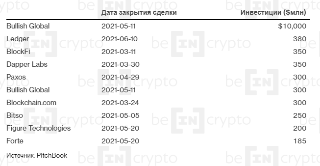 Помимо Bullish, инвесторы также вкладывались и в другие проекты, вроде Blockchain.com, Ledger и BlockFi. Средний размер вложений при исключении из выборки Bullish составил $290 млн.