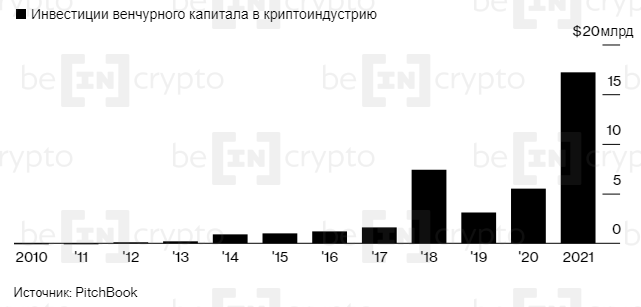 С начала 2021 года венчурные фонды вложили $17 млрд в криптовалютные компании. К такому выводу пришли аналитики компании PitchBook, пишет Bloomberg. Сообщается, что приток денег в 2021 году обогнал показатели за последние три года вместе взятые. В последний раз крупный приток был зафиксирован еще в 2018 году. Тогда на рынок поступило $7,4 млрд венчурных инвестиций.