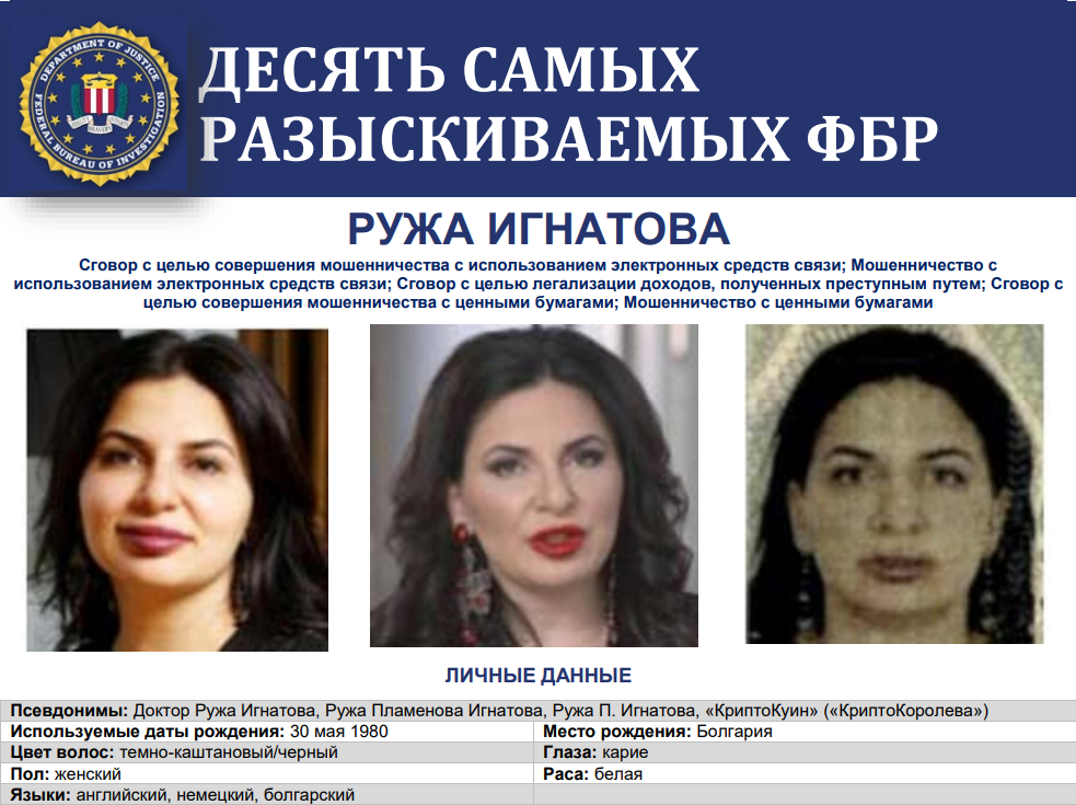SponsoredФБР утверждает, что Игнатова могла стоять во главе мошеннической схемы OneCoin, затронувшей «миллионы инвесторов по всему миру» и похитившей «миллиарды долларов». За любую информацию, которая приведет к аресту Ружи Игнатовой ФБР предлагает вознаграждение в размере до $100 000. ФБР предупреждает, что с Игнатовой путешествуют вооруженные люди, а сама «криптокоролева» уже могла сделать пластическую операцию.