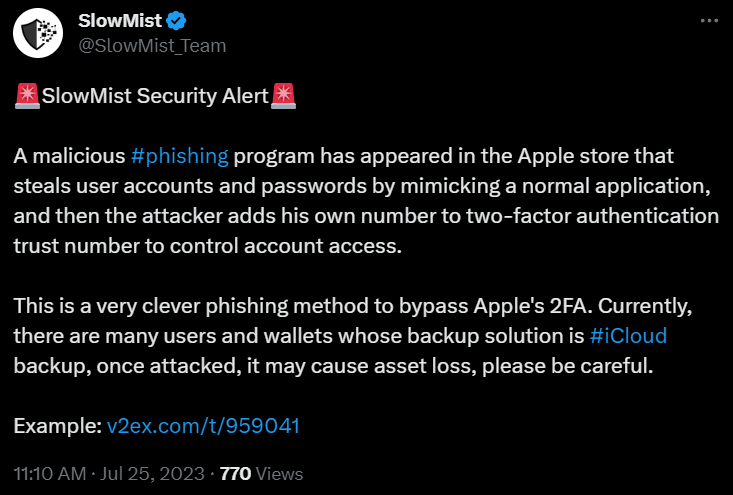 Также с помощью украденных данных мошенники подделывают номер жертвы, чтобы обойти ограничения двухфакторной аутентификации. Как утверждают в SlowMist, схема ставит под угрозу всех пользователей, которые используют облачное хранилище iCloud для авторизации в криптокошельки. Масштаб схемы остается неясен.