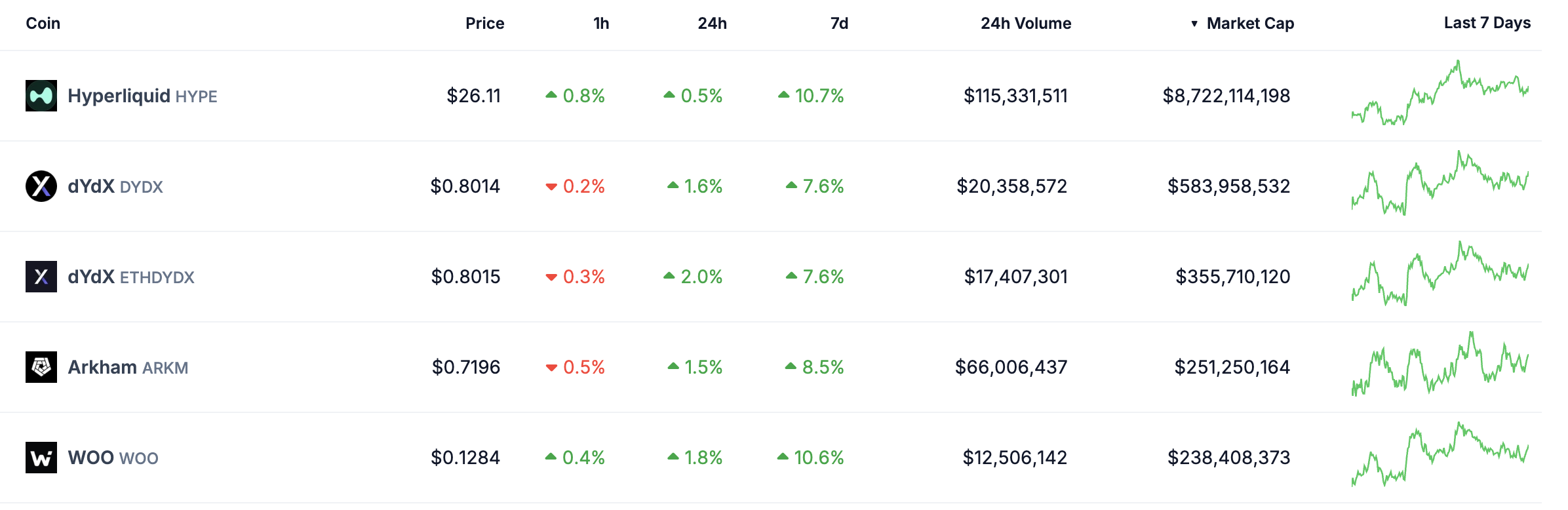 Топ-5 токенов платформ для торговли бессрочными фьючерсами показали рост за неделю. Лидер сектора — HYPE — прибавил более 10% после нескольких недель снижения.