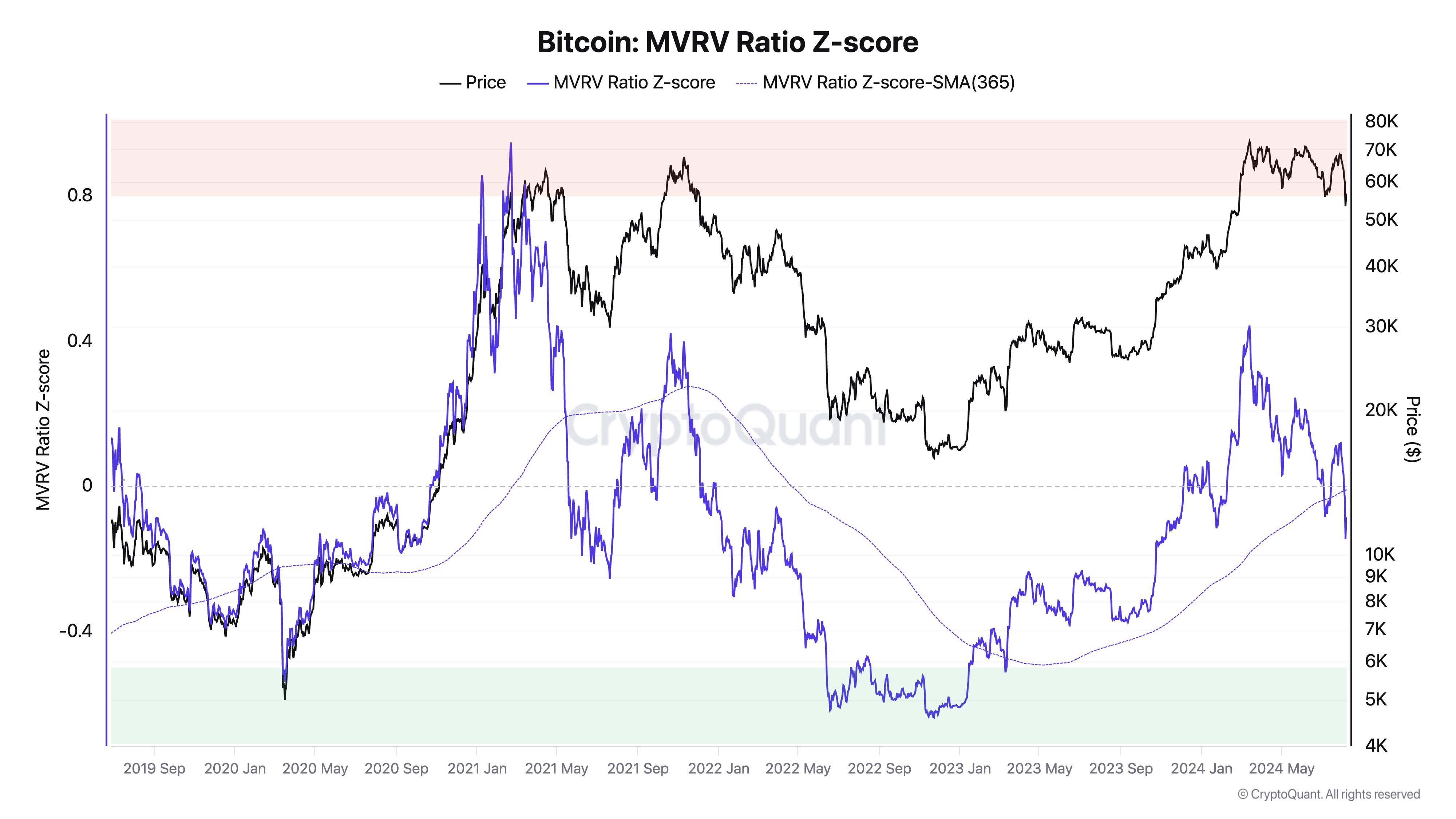 «Соотношение MVRV упало ниже своего 365-дневного скользящего среднего, что в предыдущих циклах сигнализировало о продолжении падения цен или начале медвежьего рынка», — отметили в отчете CryptoQuant.