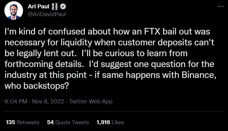 Он отметил у себя на странице в твиттере, что не совсем понимает, зачем FTX согласилась продаться Binance «ради ликвидности», если по закону клиентские активы запрещено использовать для кредитования бизнеса. Пол также задался вопросом, кто спасет Binance, если торговая площадка в условиях монополизации повторит сценарий FTX.