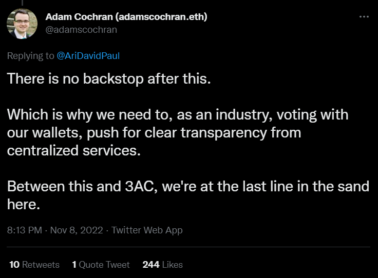 Партнер венчурной компании Cinneamhain Ventures Адам Кокран призвал криптовалютное сообщество бойкотировать централизованные биржи, если они не придерживаются прозрачной политики ведения бизнеса.