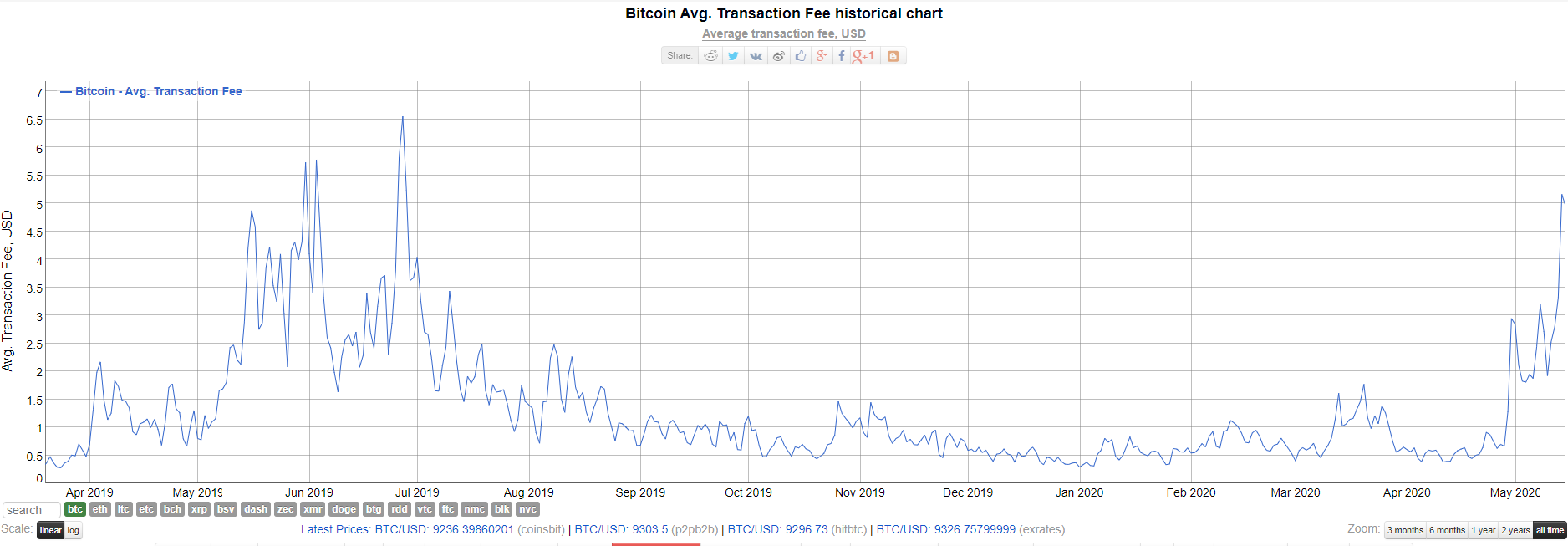 В блокчейн-сети биткоина и эфира зафиксирован резкий рост комиссий. Согласно данным ресурса BitInfoCharts, средний уровень комиссии в блокчейне биткоина уже достиг значений мая 2019 года и теперь составляет ~ $4.96 за операцию.