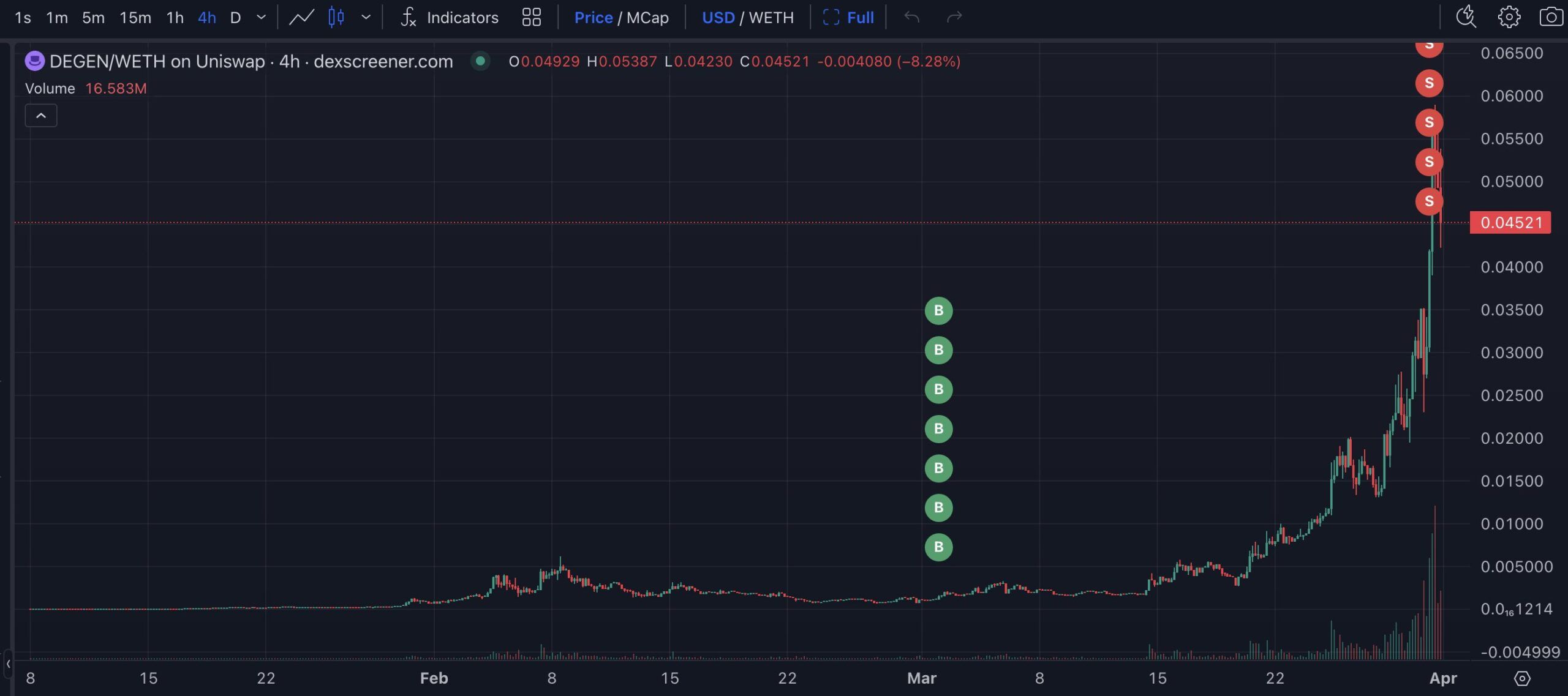 По данным CoinGecko, за последние 30 дней стоимость DEGEN выросла на 2 300%, а с момента релиза — более чем на 209 000%. В настоящее время «мемная» монета торгуется на отметке в $0,04772.