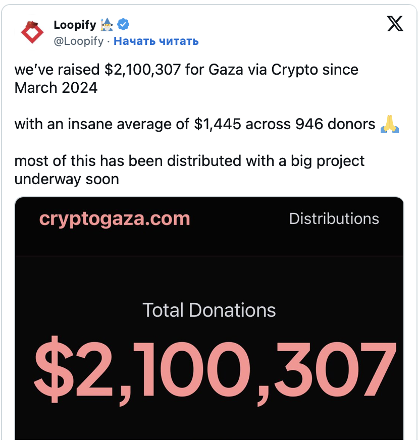 Одной из таких инициатив руководит трейдер под псевдонимом Loopify. С начала конфликта он привлек более $2,1 млн в криптовалюте для помощи пострадавшим.