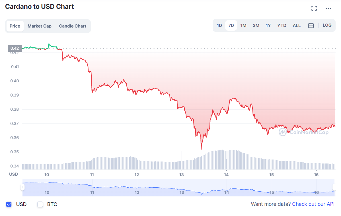 Главным неудачником недели среди криптовалют топ-10 снова оказался коин Cardano (ADA). Он завершает эту неделю, просев за последние 7 дней на 13% до $0.3675 на момент написания.