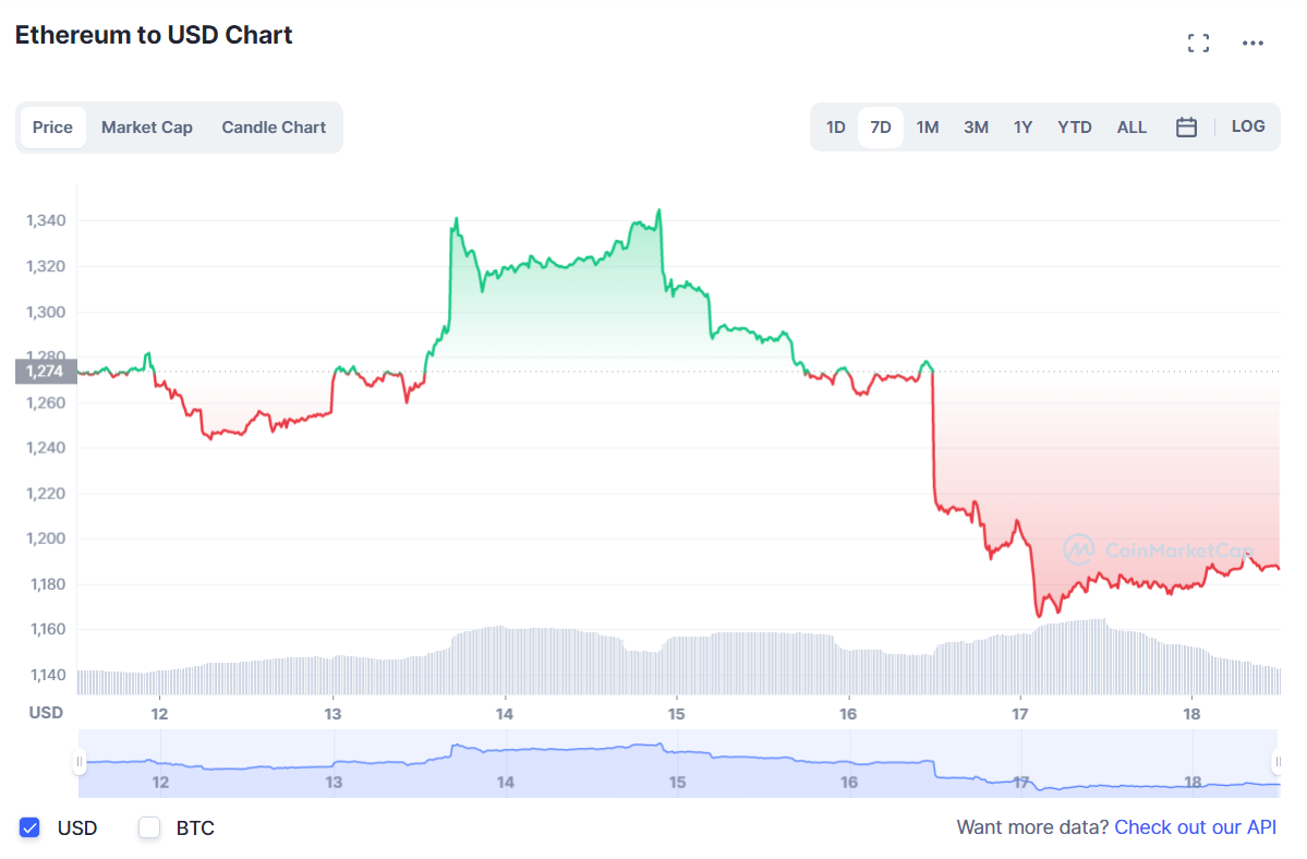 На момент написания ETH торговался с внутринедельным понижением на 6,9% в районе $1 186, согласно данным Сoinmarketcap. Технические аналитики BeInCrypto добавляют, что очередной откат цены под $1 290 может быть чреват ее снижением в направлении $1 200.