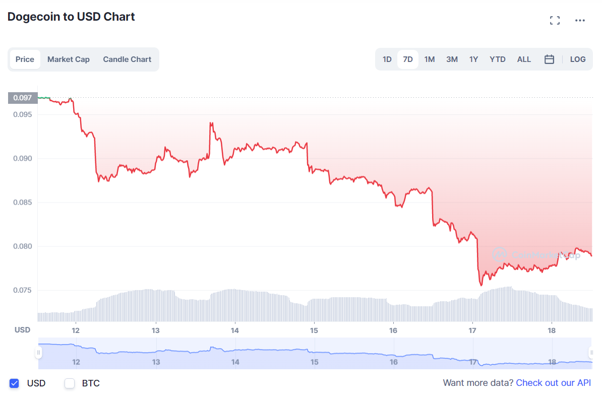 Sponsored SponsoredГлавным неудачником среди валют топ-10 на этой неделе снова оказался коин проекта Dogecoin (DOGE), просевший за 7 дней на 18,68% в район $0.0788 (на момент написания, согласно данным Сoinmarketcap).