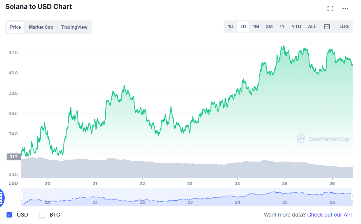 Лидером внутринедельного роста среди топ-10 криптовалют оказался коин Solana (SOL). Эту неделю он завершает, укрепившись порядка на 29% и торгуясь в районе $40.95 на момент написания.