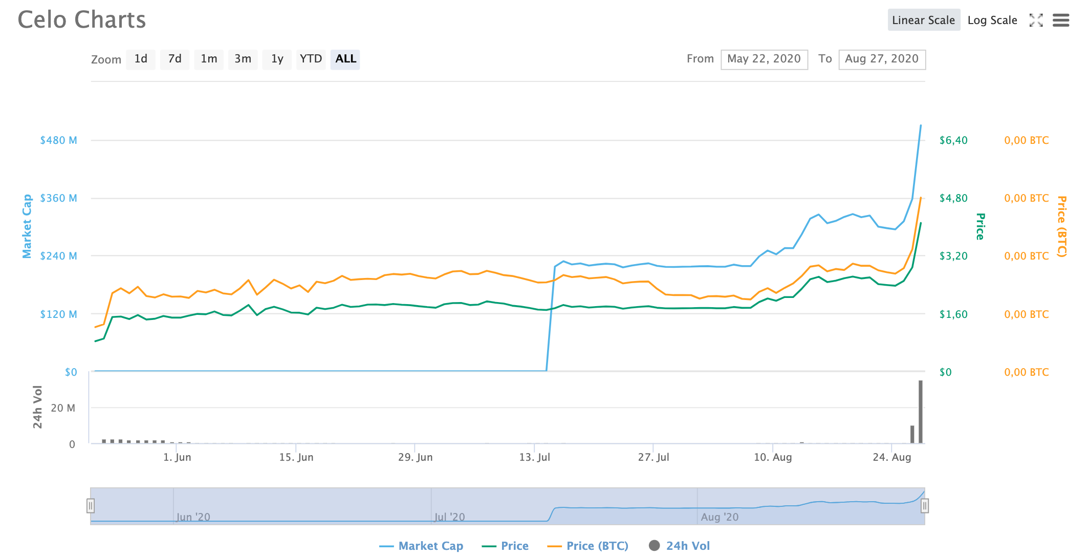 За минувшие 24 часа CELO подорожал более чем на 50% и на момент написания статьи торгуется на отметке $4.10, вблизи исторических максимумов, зафиксированных на $4.45. Рыночная капитализация монеты за сутки выросла с $350 млн до $550 млн, а объем торгов за два дня взлетел более чем на 6500%. CELO сейчас занимает 33 место в рейтинге криптовалют CoinMarketCap
