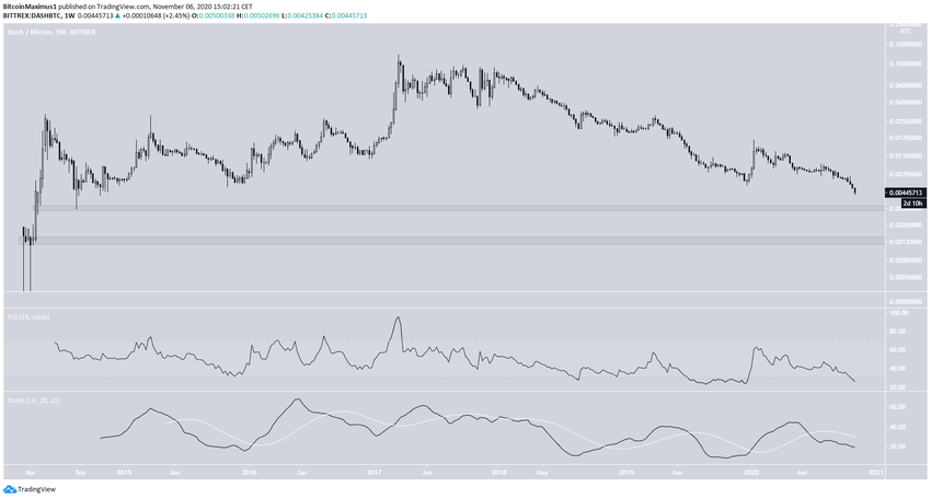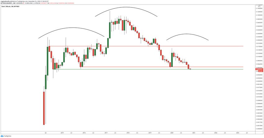 Криптовалютнфй трейдер @CryptoDonAlt опубликовал в твиттере график DASH/BTC и утверждает, что пара достигла фазы капитуляции, не подавая сигналов бычьего разворота.