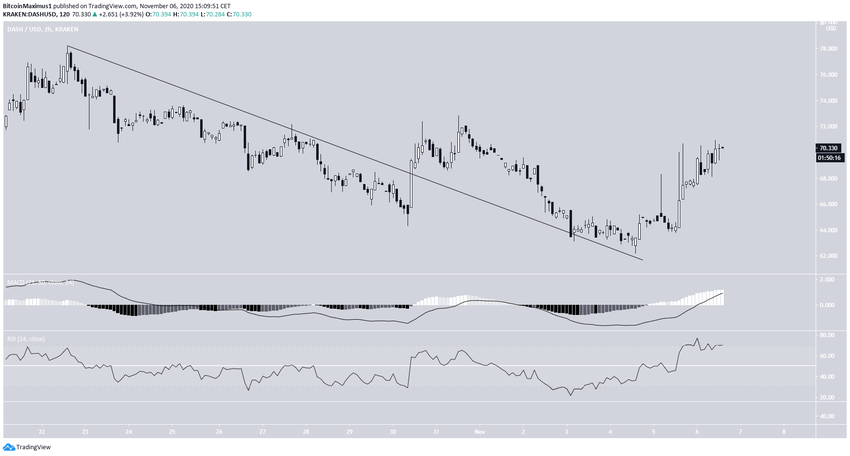DASH торгуется в диапазоне $65-$77 с начала сентября. 4 ноября цена нарушила целостность поддержки, достигнув минимума $62.14, но тут же отскочила. Такая динамика, как правило, предвещает резкое движение в том или ином направлении.
