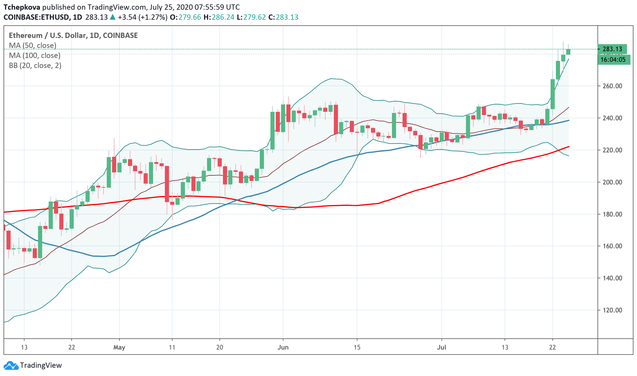 Курс Ethereum начал расти в среду вслед за резким и неожиданным скачком биткоина выше отметки $9,300. Однако если первая криптовалюта притормозила после прорыва $9,500, эфир не остановился на достигнутом и в пятницу обновил годовой максимум на уровне $287.80.