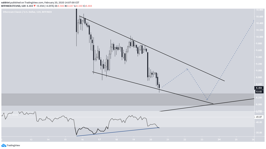 На краткосрочных таймфреймах курс ETC торгуется внутри нисходящего паттерна «клин». Кроме того, динамика RSI подает сигналы бычьей дивергенции.