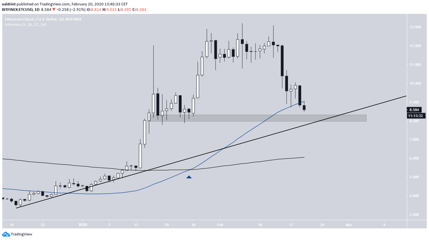 Курс Ethereum Classic отметил 6 февраля максимум на $13.19, после чего начал снижаться. Цена почти достигла важной области поддержки, пробой которой подтвердит нисходящий тренд.