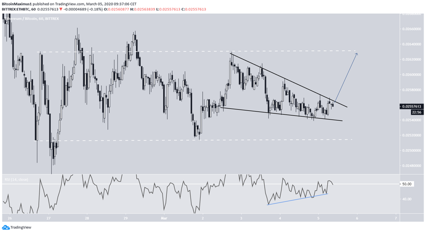 С 26 февраля курс Ethereum торгуется в диапазоне ₿0.0251-₿0.0263. Цена достигла 2 марта линии сопротивления, а затем отступила на юг.