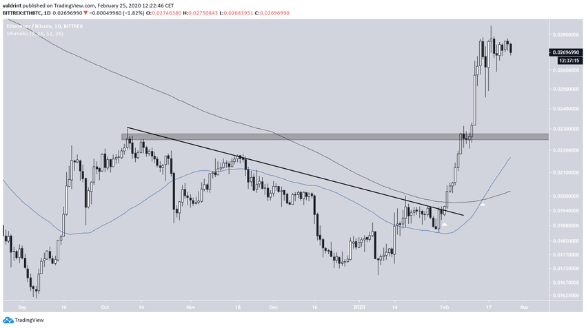 Область ₿0.025 на протяжении всего 2018 и половины 2019 года играла роль поддержки, после чего была пробита медведями. Это делает ее сейчас очень важной областью. Поскольку Ethereum уже совершил ее бычий пробой, мы не думаем, что он снова опустится под нее.