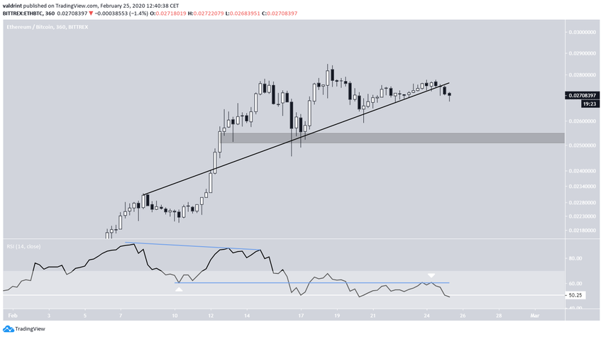 На краткосрочном графике цена совершила медвежий пробой линии восходящей поддержки. Мы можем выделить поддержку в области ₿0.0252, которую пара тестировала уже трижды.