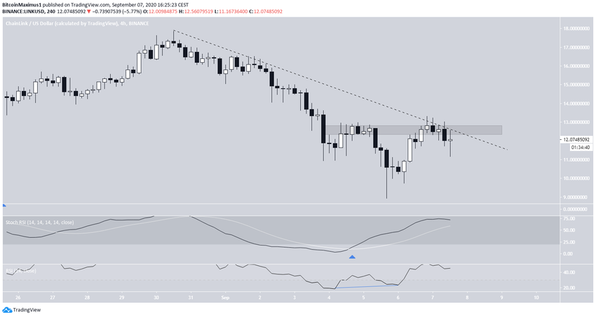 Курс криптовалюты ChainLink (LINK) отметил 17 августа максимум на $20.71 и с тех пор снижался. За это время цена сформировала один понижающийся максимум, что позволяет нам построить линию нисходящего сопротивления. Впрочем, цена касалась ее недостаточное количество раз для того, чтобы с точностью определить угол ее наклона.