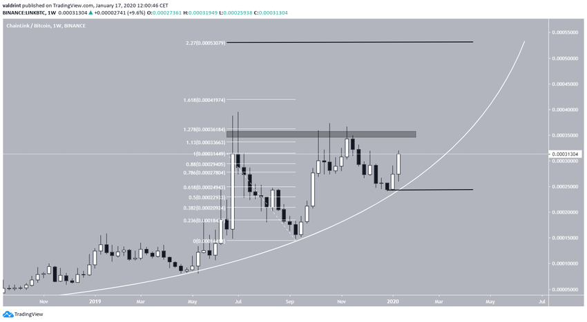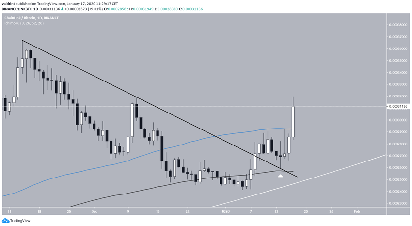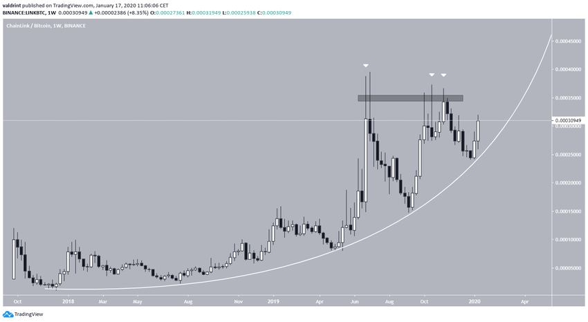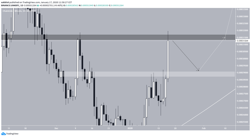 Таким образом, курс LINK совершил бычий прорыв линии нисходящего сопротивления, сохранявшейся на рынке с ноября 2019 года. С тех пор цена растет, и, как мы полагаем, вскоре она может предпринять еще одну попытку пробоя области сопротивления 35,000 сатоши.