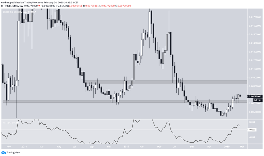 Оттолкнувшись от поддержки ₿0.007, криптовалюта сформировала бычью свечу на прошлой неделе. Эта область оказывала поддержку LTC в октябре 2017 года и в декабре 2018 года.