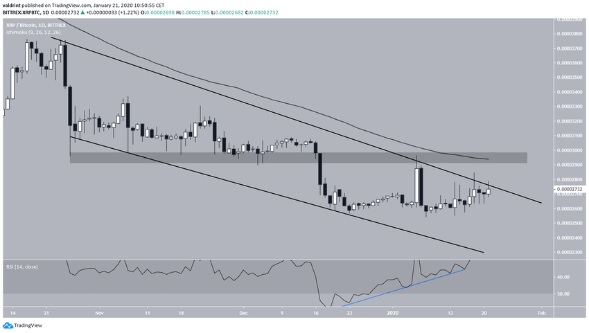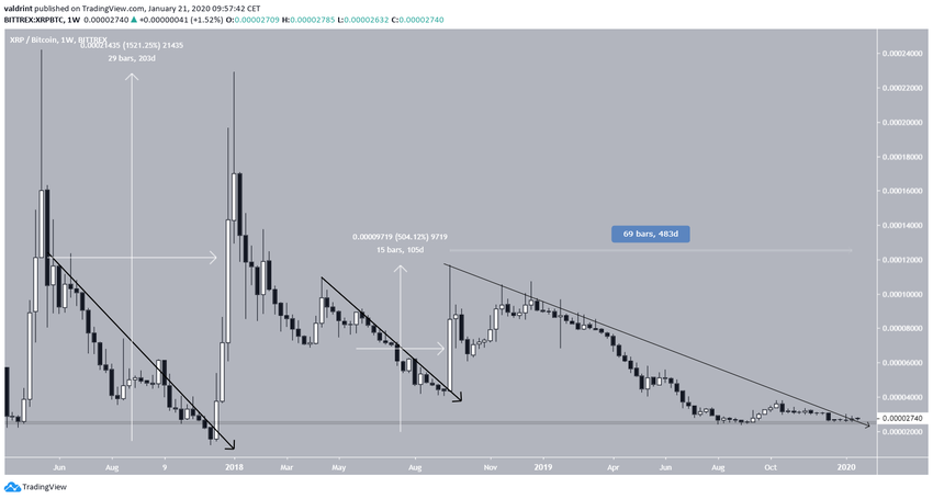 С 2017 года курс XRP дважды следовал вдоль линий нисходящего сопротивления. Эти фазы продолжались 203 и 105 дней, соответственно. Последующий бычьи прорывы этих линий дали старт росту цены на 1,521% и 504%. Это дает основания предполагать, что длина линии сопротивления имеет значение и напрямую определяет силу прорыва.