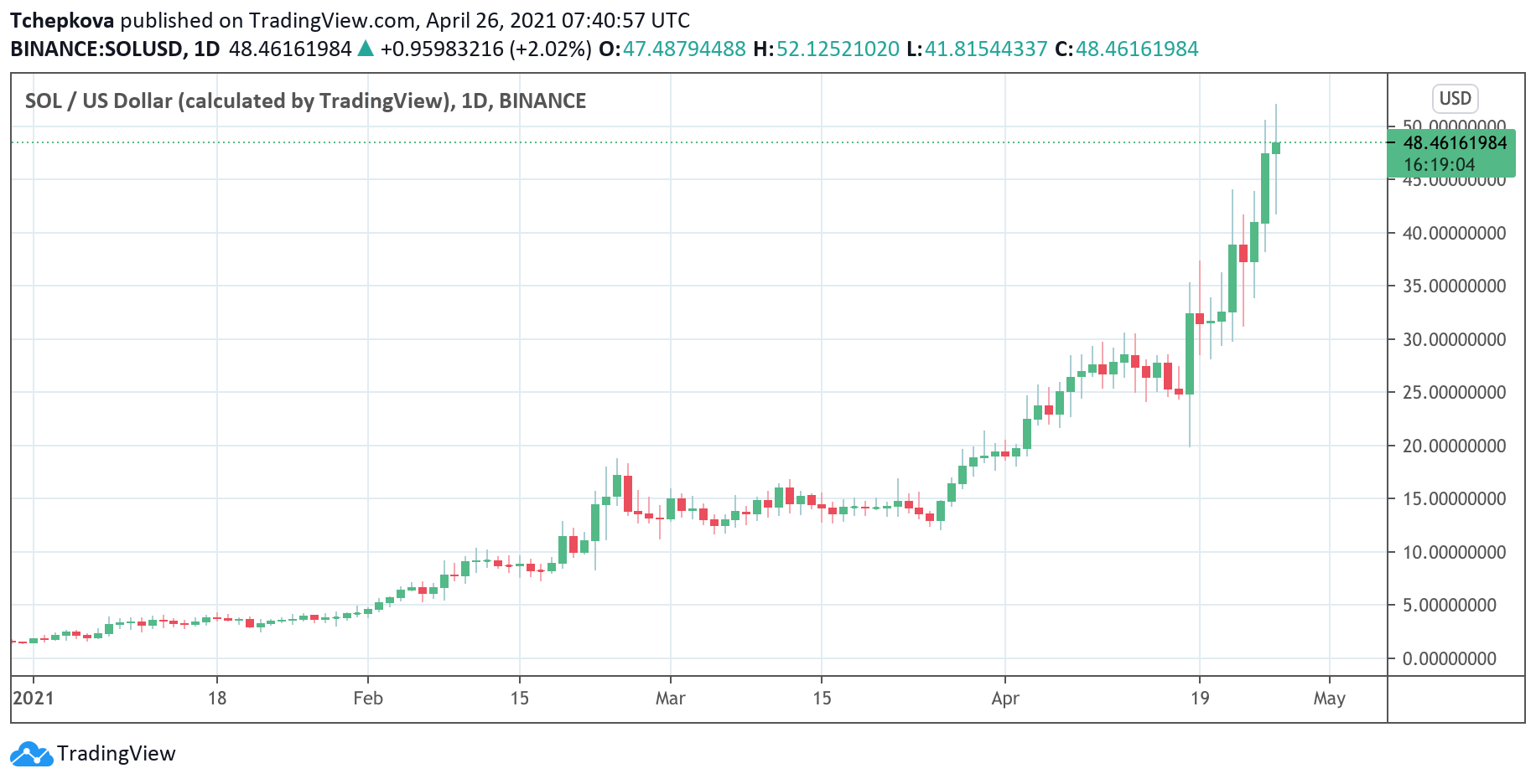 За минувшие семь дней токен подорожал на 54% и в воскресенье, 25 апреля, достиг нового исторического максимума на уровне $48,43. С начала 2021 года Solana (SOL) подорожал на 2800%.