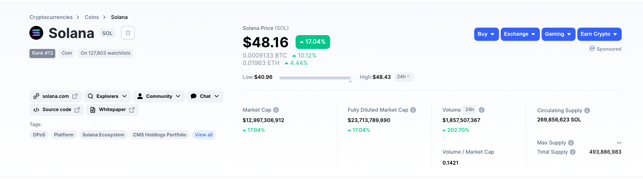 Проекту Solana нет еще и года, но он уже успел зарекомендовать себя в криптоиндустрии. Сейчас токен занимает 13 строчку в рейтинге криптовалют с рыночной капитализацией $12,9 млрд.