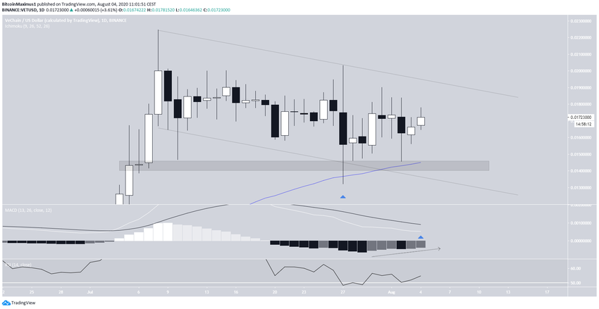 Цена встретила поддержку над уровнем $0.0154, который совпадает с 50-дневной скользящей средней. Кроме того, MACD повышается, и, возможно, готовится к бычьему пересечению, тогда как дневной RSI удерживается над уровнем 50. Таким образом, сигналы говорят в пользу движения к линии сопротивления канала.