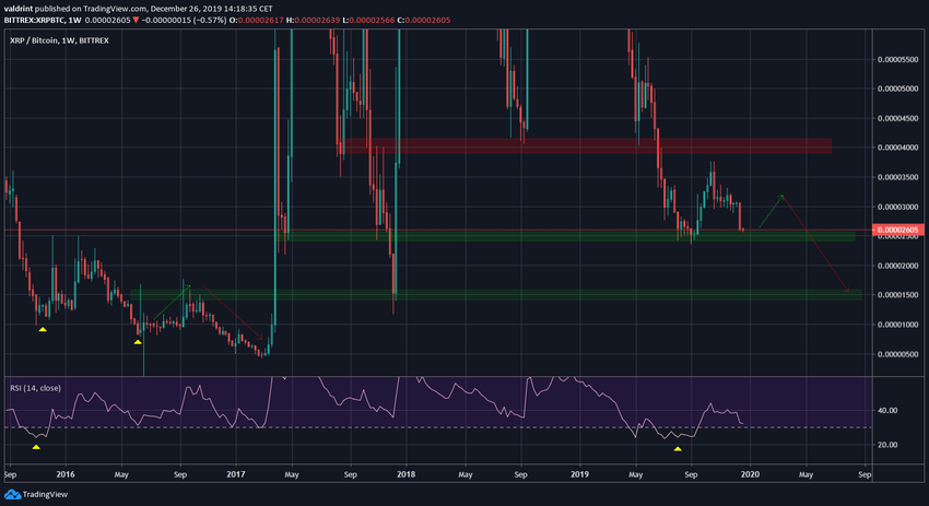 Курс XRP снижается с декабря 2018 года, потеряв за это время 76% своей стоимости. Сейчас пара, вероятно, формирует двойное основание в области поддержки 2500 сатоши.