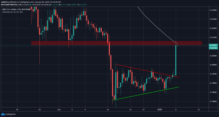 Курс XRP совершил 16 декабря медвежий прорыв область поддержки $0.21. На следующий день цена отметила минимум на $0.18, после чего сформировала на графике симметричный треугольник. Поскольку этот паттерн считается моделью продолжения, и он появился после медвежьего хода, это сулило паре продолжение снижения.