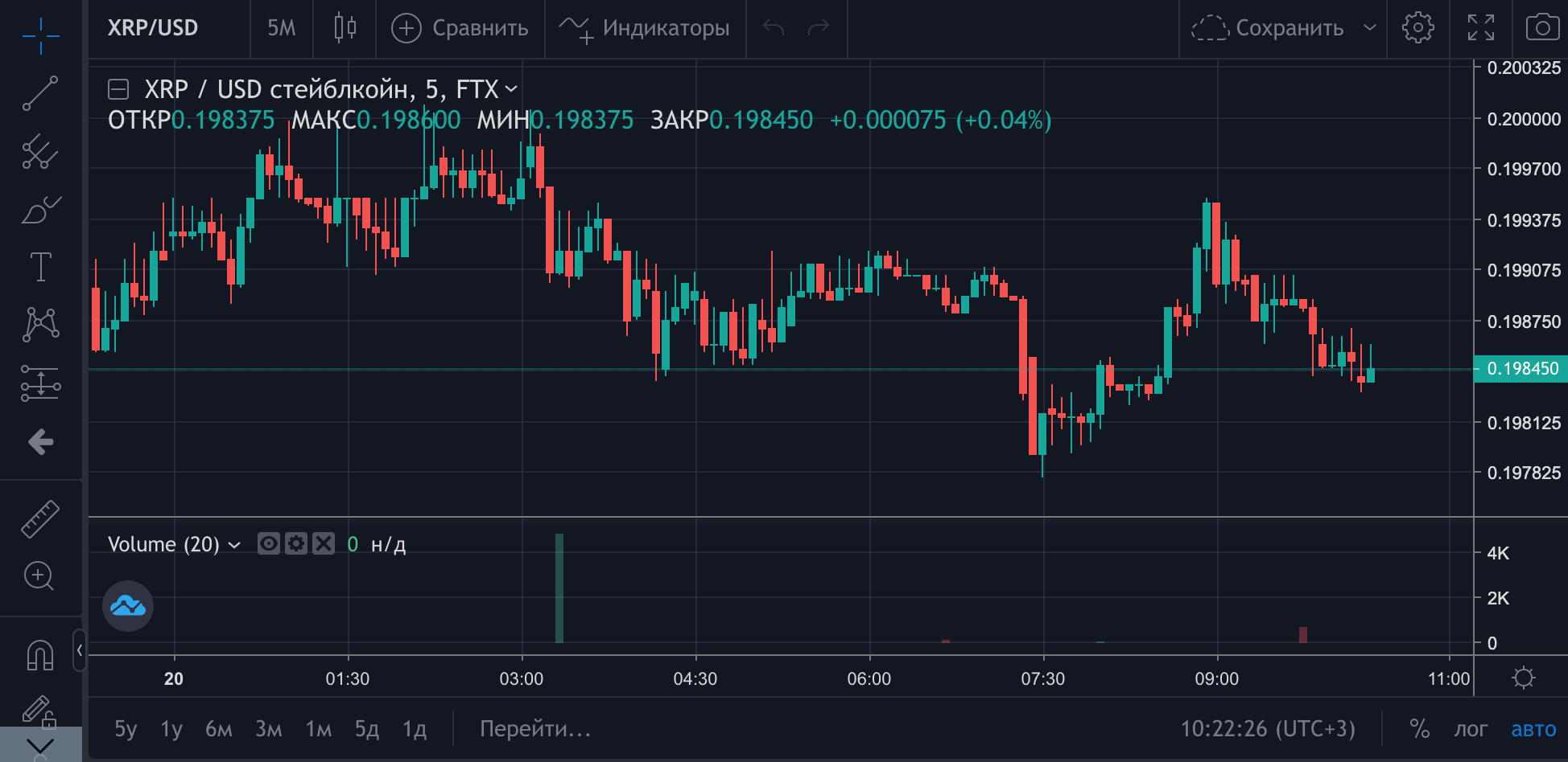 Торги в паре открылись в 13:25 UTC (16:25 мск.) в воскресенье, 19 июля. На момент написания статьи XRP/USD торгуется на бирже по цене $0,1989, что в целом соответствует среднему курсу по рынку. Четвертая по величине цифровая монета с текущей рыночной капитализацией $8,81 млрд попыталась преодолеть психологическую отметку $0,2000 на утренних торгах в понедельник, но не сумела развить устойчивую восходящую динамику и вернулась в прежний диапазон.