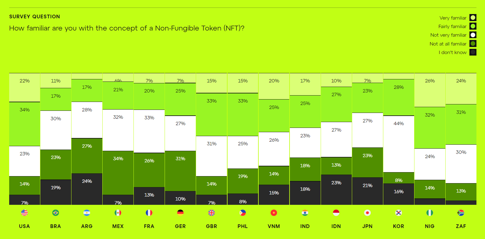 По данным Consensys, большинство респондентов заявили, что не разбираются в NFT. Больше всего цифровые коллекционные токены известны в США, Индии и Южной Африке. В то же время в Южной Америке, Европе и Японии меньше всего осведомлены об NFT.