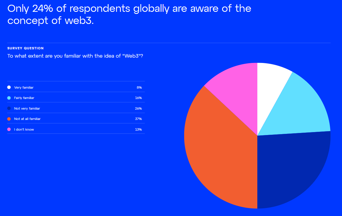 Всего 24% участников исследования Consensys ответили, что знакомы с понятием Web3, при этом о криптовалютах слышали 90% респондентов