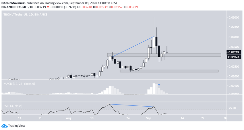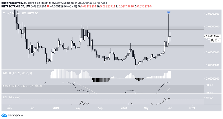 На момент написания анализа курс TRX торговался между долгосрочными уровнями сопротивления и поддержки $0.04 и $0.024, соответственно.