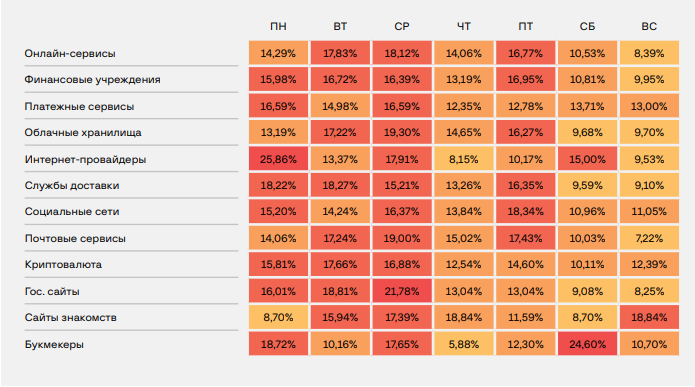 Кроме того, эксперты также подсчитали активность фишинговых атак по дням недели. Криптоориентированные атаки, в основном, наблюдаются в начале рабочей недели (понедельник 15,81%, вторник 17,6% и среда 16,8%). Аналогичная тенденция сохраняется и в случае с гос.сайтами и финансовыми учреждениями. При этом больше всего по процентному соотношению осуществляются атаки на интернет-провайдеры, букмекеры и гос.сайты.