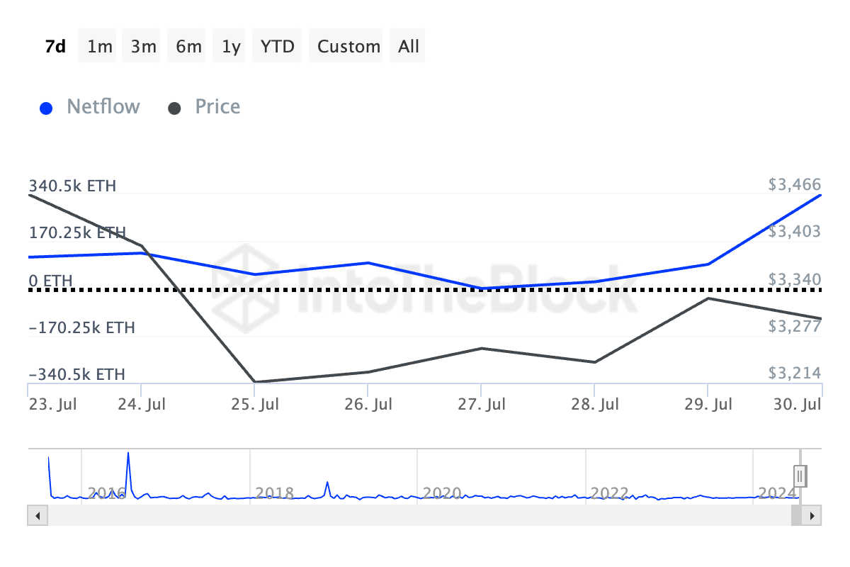Рынок надеется, что запуск спотовых ETF на Ethereum (ETH) приведет к увеличению притока капитала в актив и поддержит рост цены. На этом фоне киты ETH активизировали накопление. Данные IntoTheBlock показали увеличение чистого потока средств в сегменте крупных держателей на 167% за последние семь дней.