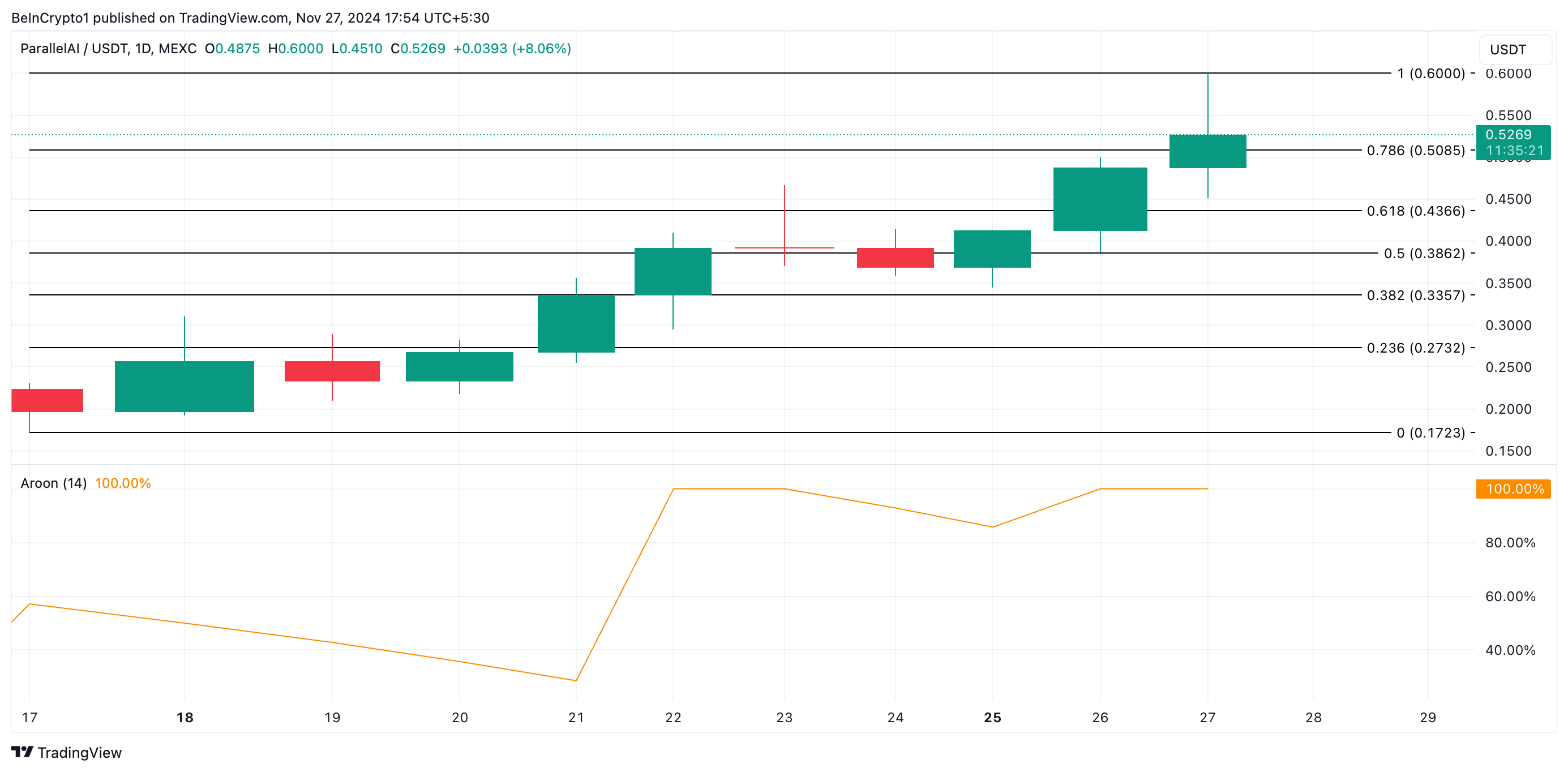 PAI сегодня достиг рекордного уровня $0,60, но потом снизился на 14%. Однако бычье давление все еще усиливается. Индикатор Aroon подтверждает этот прогноз. Значение Aroon Up для PAI составляет 100% на момент написания.
