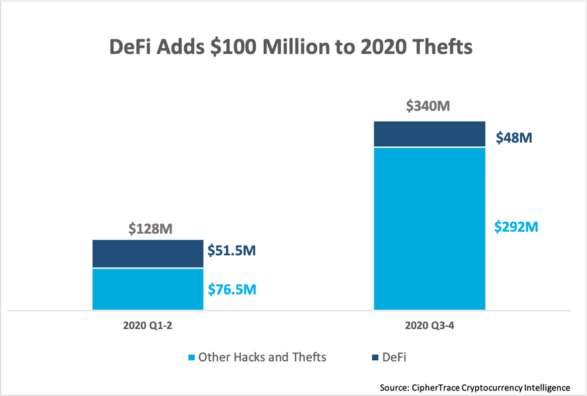 Бум привлек внимание хакеров и нечестных игроков, которые поспешили воспользоваться новым трендом. Хотя криптовалютная киберпреступность снизилась на 60% в этом году, более 21% объема всех крипто взломов пришлось на пространство DeFi. В первом полугодии на DeFi приходилось 45% всех краж (47,7 млн), а за второе полугодие статистика выросла до 50% (51,5 млн).